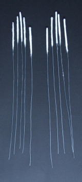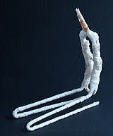 | 22 その上に糊を塗り、 桐粉を吹き付ける。 23 脱脂綿を細く巻いて髪にする。 |
