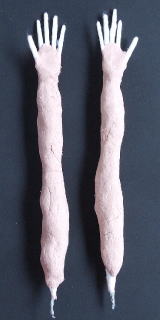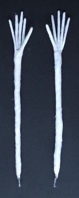 6 ポーズを少し調整し、細かい部 7 針金に脱脂綿を巻いて指にする。腕の部分に綿を巻 8 掌、腕の部分に大まかに桐塑をのせる